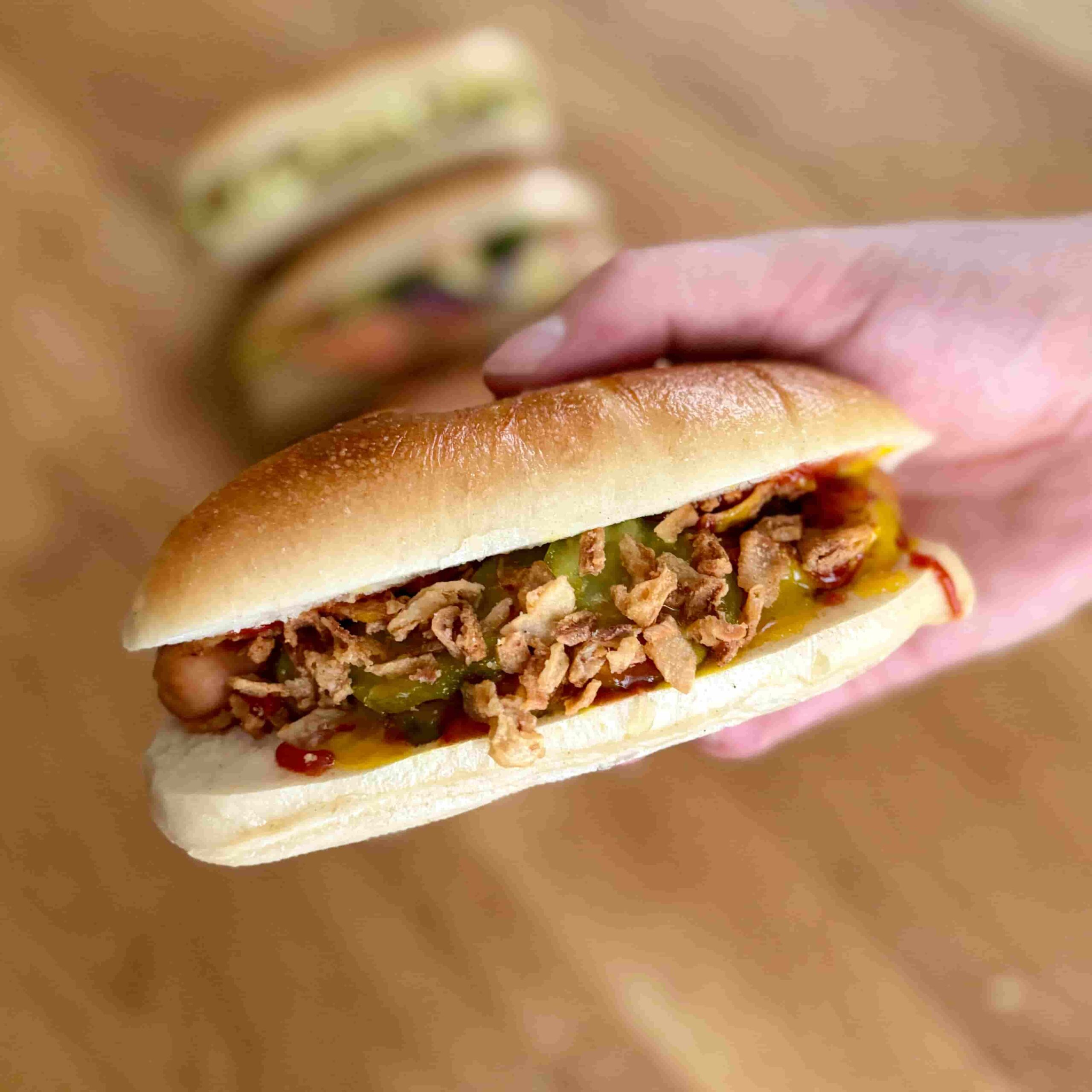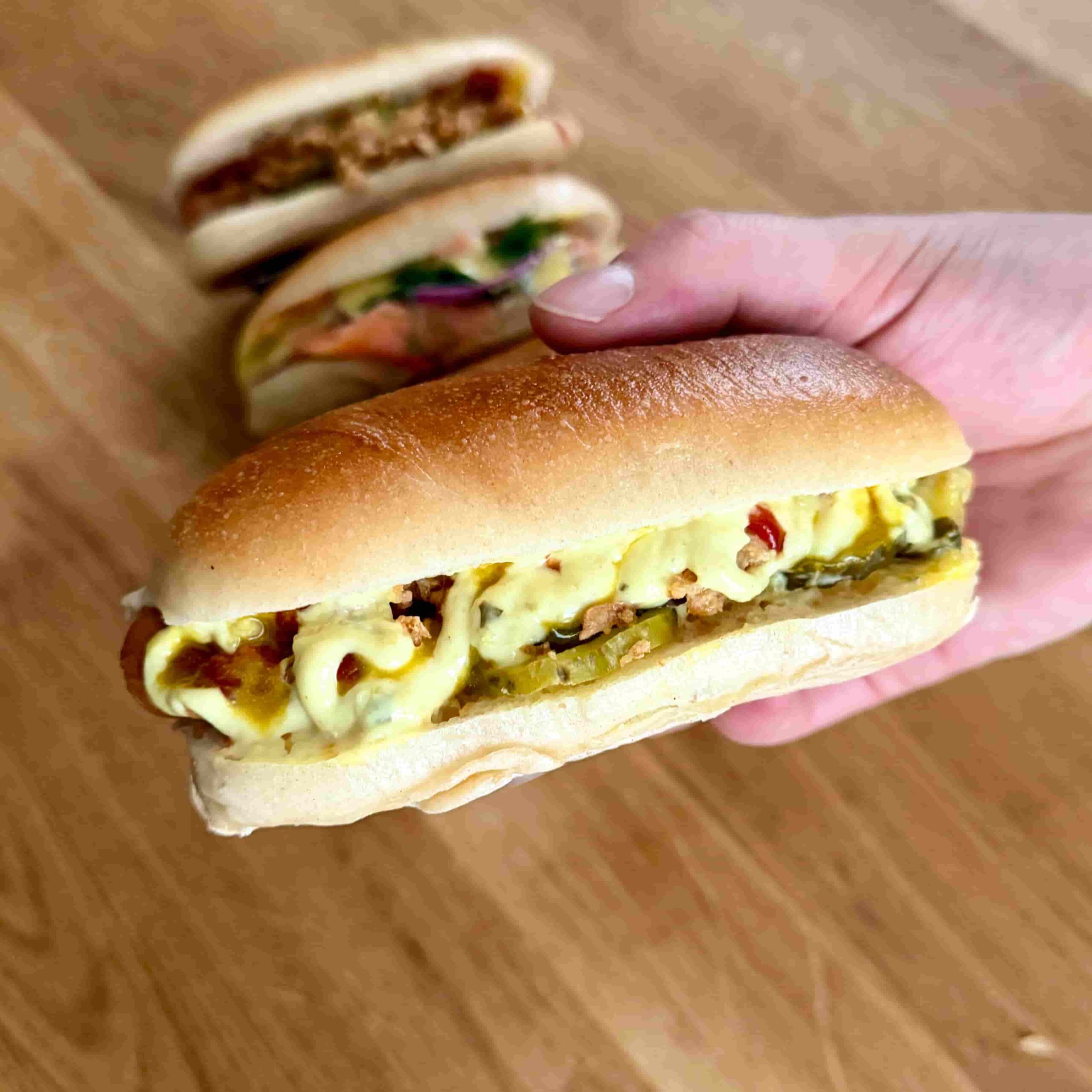 Hot Dog im dänischen Stil mit Remoulade und klassischen Zutaten.