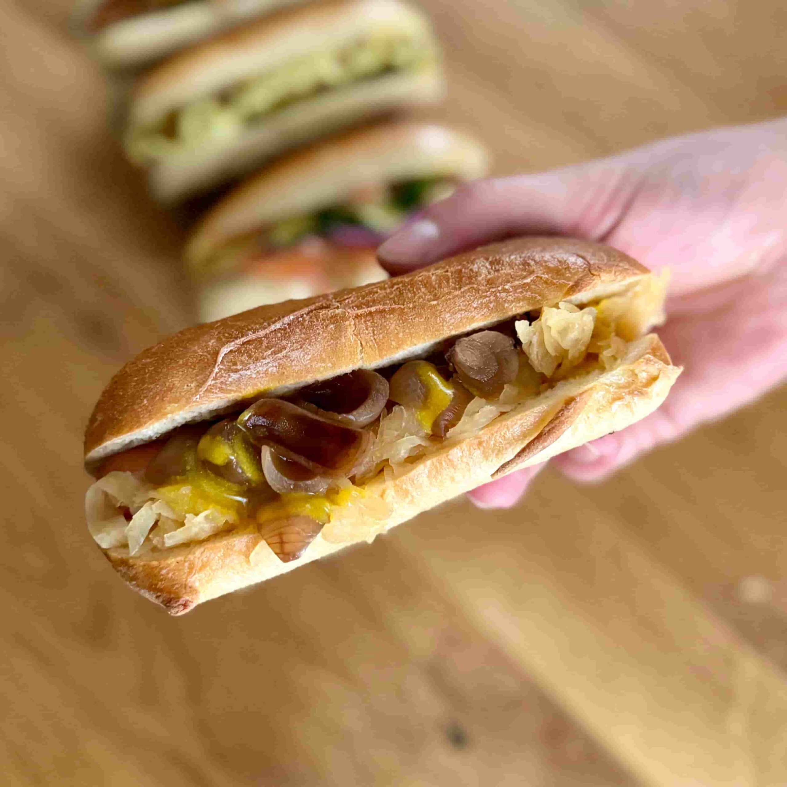 Hot Dog mit Sauerkraut und süß eingelegten Zwiebeln